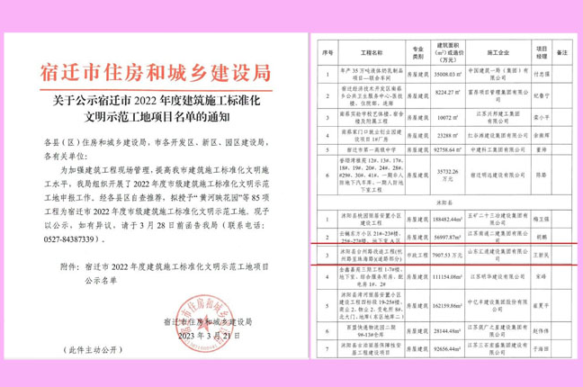 用心做好文明施工積極打造文明示范工地沭陽縣臺州路改造工程(道路部分)獲評標準化文明示范工地 3月21日,宿遷市住房和城鄉建設局公布了2022年度建筑施工標準化文明示范工地項目,集團承建的沭陽縣臺州路改造工程(杭州路至珠海路)(道路部分)工程獲評。 2022上半年,工程曾榮獲江蘇省省級星級標準化安全文明工地。項目部始終貫徹落實集團創優工作,對安全文明工地進行提前策劃,施工過程嚴格按照質量標準管理,本次宿遷市建筑施工標準化文明示范工地申報工作,項目部及上級單位高度重視、提前組織、精心準備,也充分展現了集團安全文明施工的管理水平和企業文化。 接下來,項目部將堅定不移地推行施工工藝標
