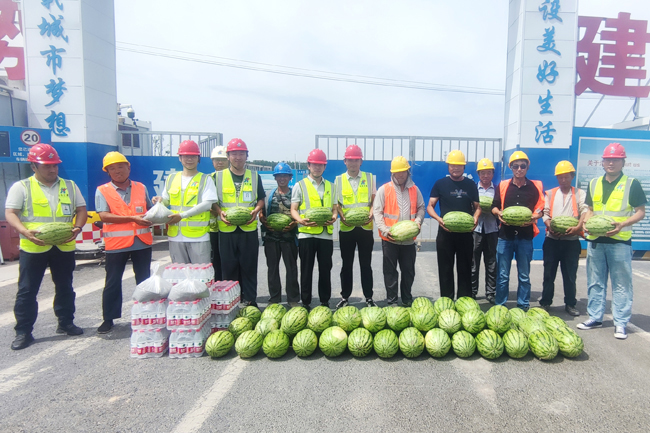 烈日炎炎、驕陽似火,進入7月以來,連續多日發布高溫橙色預警,為做好高溫期間安全生產工作,保障現場施工安全,匯通集團分會組織開展“夏送清涼”慰問一線活動,深入工地、走近工友,把清涼送到施工一線、把關懷送到職工心坎里。 7月6日,分管經理袁鵬、綜合辦公室主任馬婕帶領匯通集團分會小組走進項目部,開展“夏送清涼”慰問一線活動,為每個施工班組送上清熱解渴的礦泉水、西瓜、綠豆等防暑降溫物資,對炎炎夏日奮戰在一線的廣大職工及勞務人員表示親切慰問,叮囑一線人員要保證人身安全,適當科學合理安排作息時間,根據氣溫情況,避開高溫時段,切實做好防暑降溫工作,同時要求各施工隊伍堅持“安全高于一切、質量重于泰山”理