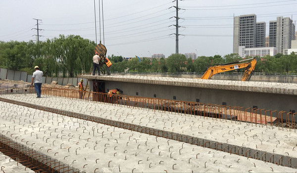 5月18日上午9時(shí),濱河南路拓寬改造工程第一塊T型板梁正式開始吊裝。該橋設(shè)計(jì)寬26米,橋跨18米,橋型為一跨簡(jiǎn)支變截面肋梁橋,主梁采用裝配式后張預(yù)應(yīng)力混凝土變截面T梁,吊裝后濕接。經(jīng)過連續(xù)不間斷作業(yè),于下午16時(shí)圓滿完成七塊主梁、兩塊邊梁,共計(jì)九塊板梁的吊裝任務(wù),比原計(jì)劃提前一天,至此標(biāo)志著橋梁主體結(jié)構(gòu)工程順利完成。為保障此次吊裝作業(yè)的順利進(jìn)行,項(xiàng)目部科學(xué)部署,精心組織,提前策劃,并與交警等相關(guān)部門充分溝通,確定合理的運(yùn)輸路線和時(shí)間。項(xiàng)目部設(shè)立吊裝安全保障小組、明確責(zé)任分工;詳細(xì)制定切實(shí)可行的施工方案,做到以方案指導(dǎo)施工;認(rèn)真做好各項(xiàng)施工前準(zhǔn)備工作:包括技術(shù)準(zhǔn)備、機(jī)械設(shè)備準(zhǔn)備、勞動(dòng)組織準(zhǔn)備、施